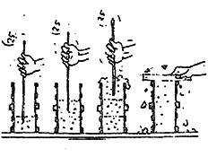 - Llenado de moldes: colocar una primer capa de hormigón; aplicar 25 golpes (sin golpear el fondo) con una varilla metálica lisa de de 60cm. de largo por 1,6 cm. de diámetro, terminada en punta roma; colocar la segunda capa, aplicar 25 golpes cuidando que la varilla penetre ligeramente la capa inferior y así colocar la tercera capa aplicando otros 25 golpes; la tercera capa contendrá un exceso de hormigón; después golpear los lados del molde suavemente con la varilla y enrasar, juntando el hormigón sobrante con una cuchara.